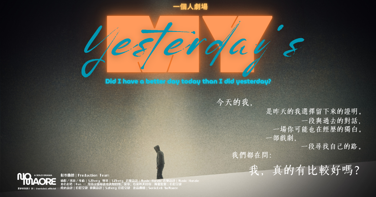 《Yesterday’s MY》是一部融合音樂、戲劇與即時觀眾對話的一人音樂劇,由創作者 Ren 所飾演的角色在舞台上獨自掙扎、懷疑、崩潰、站起來,再次跌倒——不為戲劇高潮,只為貼近現實的反覆與真實。